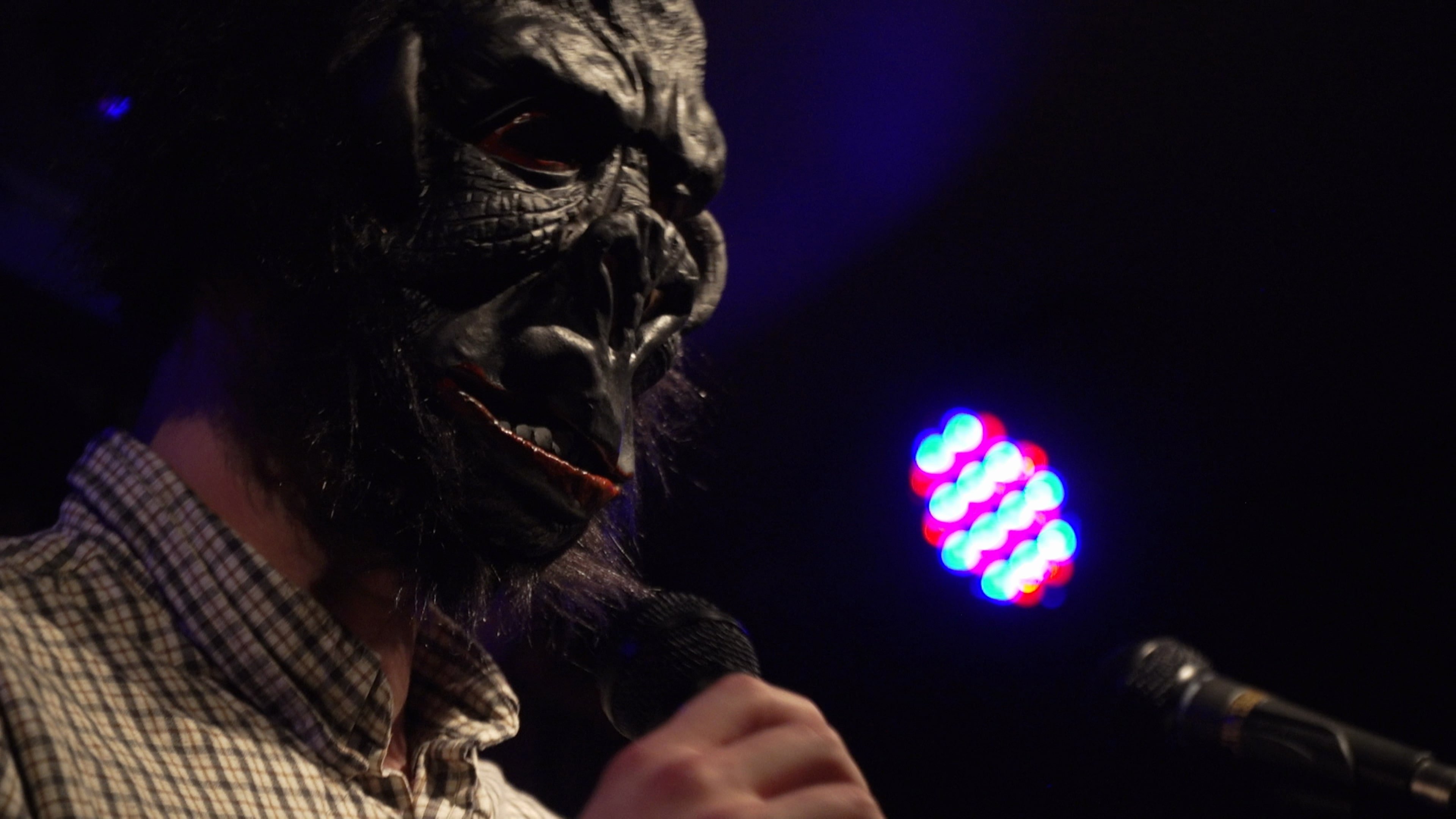 A depressed man, dressed as a gorilla, performs a stand-up comedy set.