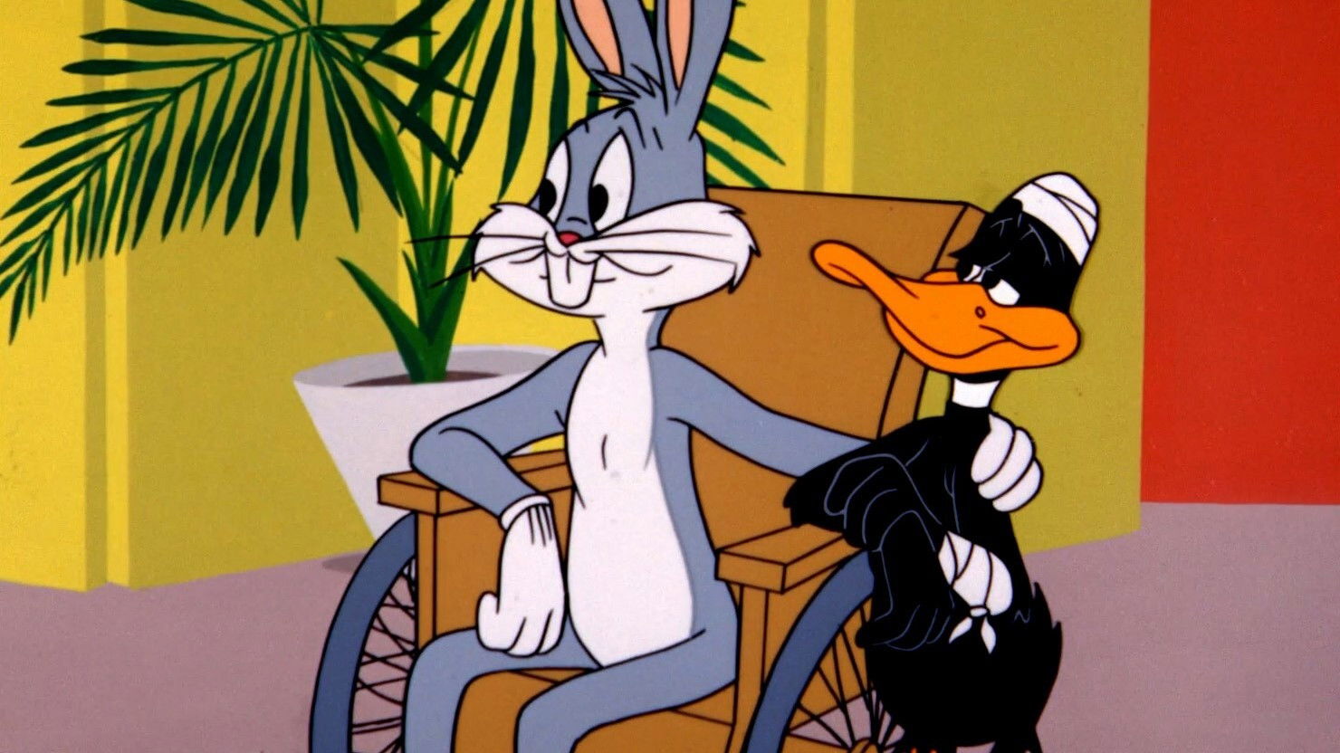 Bugs races Daffy to get to the TV station first and win the prize on the "Beat Your Buddy" show.